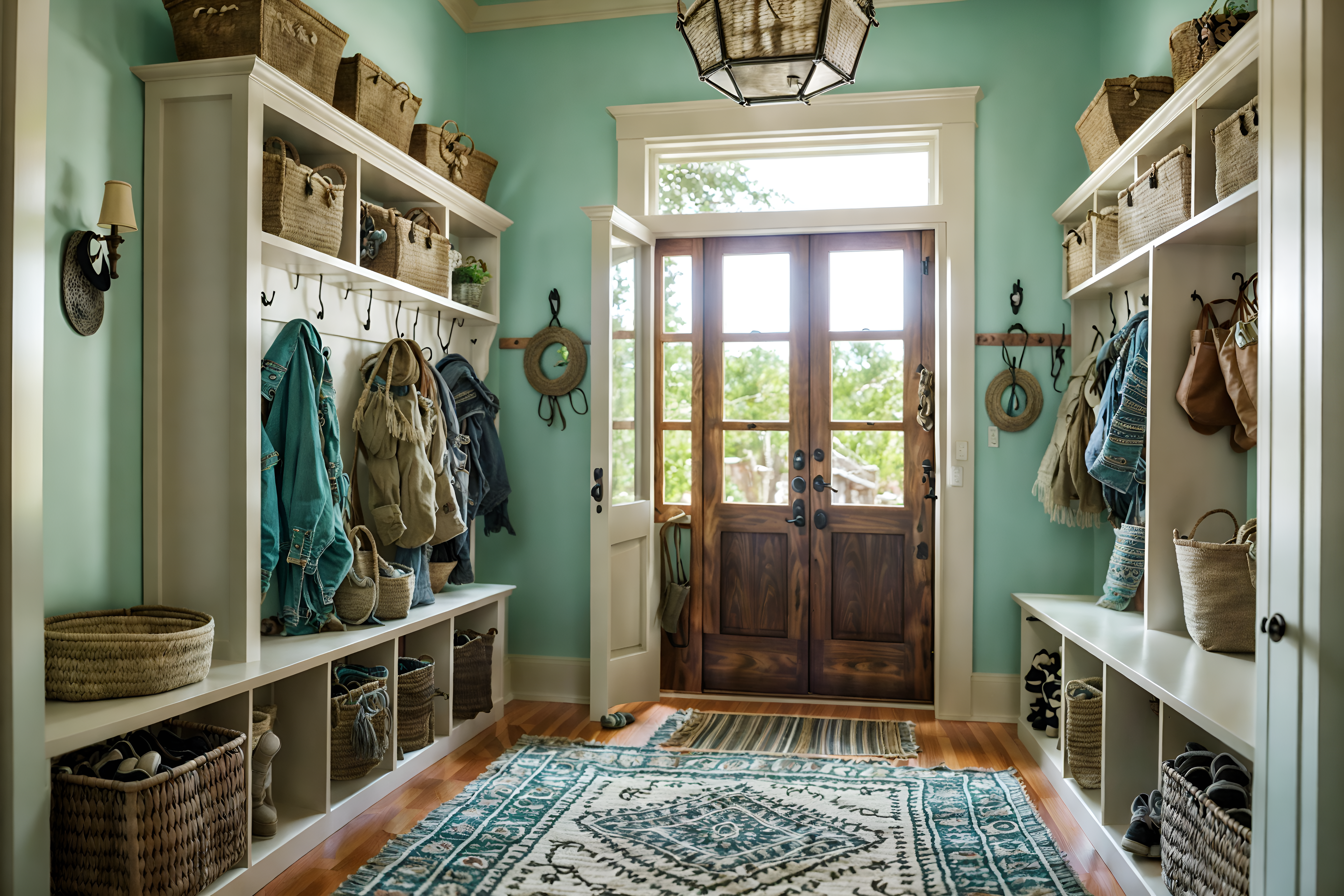 Boho-chic-style Mudroom Interior With Wall Hooks For Coats And Cubbies And… – Interior AI, Photo by interiorai.com, is licensed under CC BY-ND 4.0