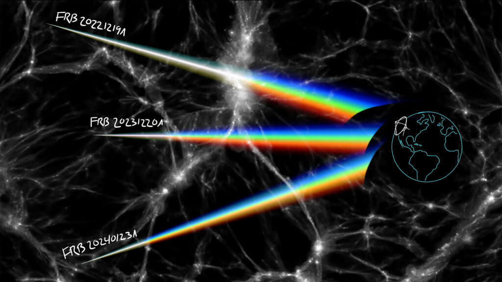A large population of faraway FRBs could effectively act as probes of material across gigantic distances. As these bursts traverse the cosmos, they encounter and pass through gas and plasma distributed throughout intergalactic space and within host galaxies. By analyzing how the FRB signal is dispersed and modified during its journey, scientists can infer properties of this intervening material, providing insights into the distribution of baryonic (ordinary) matter in the universe.